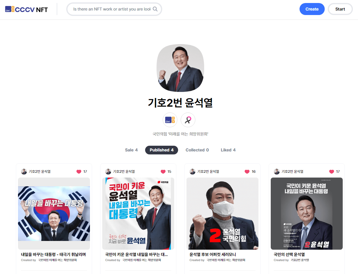 In addition, the topic of crypto also played a decisive role in the election campaign for the first time. After all, the younger population in South Korea in particular is considered to be particularly tech-savvy. Both candidates had created campaign-related NFTs during their campaigns. The conservative election winner Yoon Suk-yeol, for example, had placed 4,000 NFTs at a price of 40 US dollars each on the South Korean NFT marketplace CCCV in advance (see figure below).