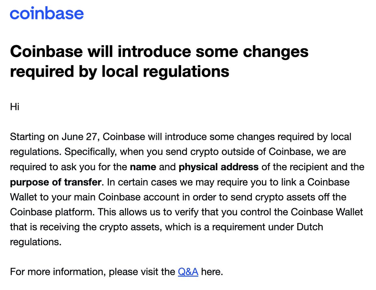 From June 27th, new rules will apply to them when they transfer coins from the exchange. According to the country's regulations, Coinbase explains that you have to ask "for the name and physical address of the sender and for the purpose of the transfer".
